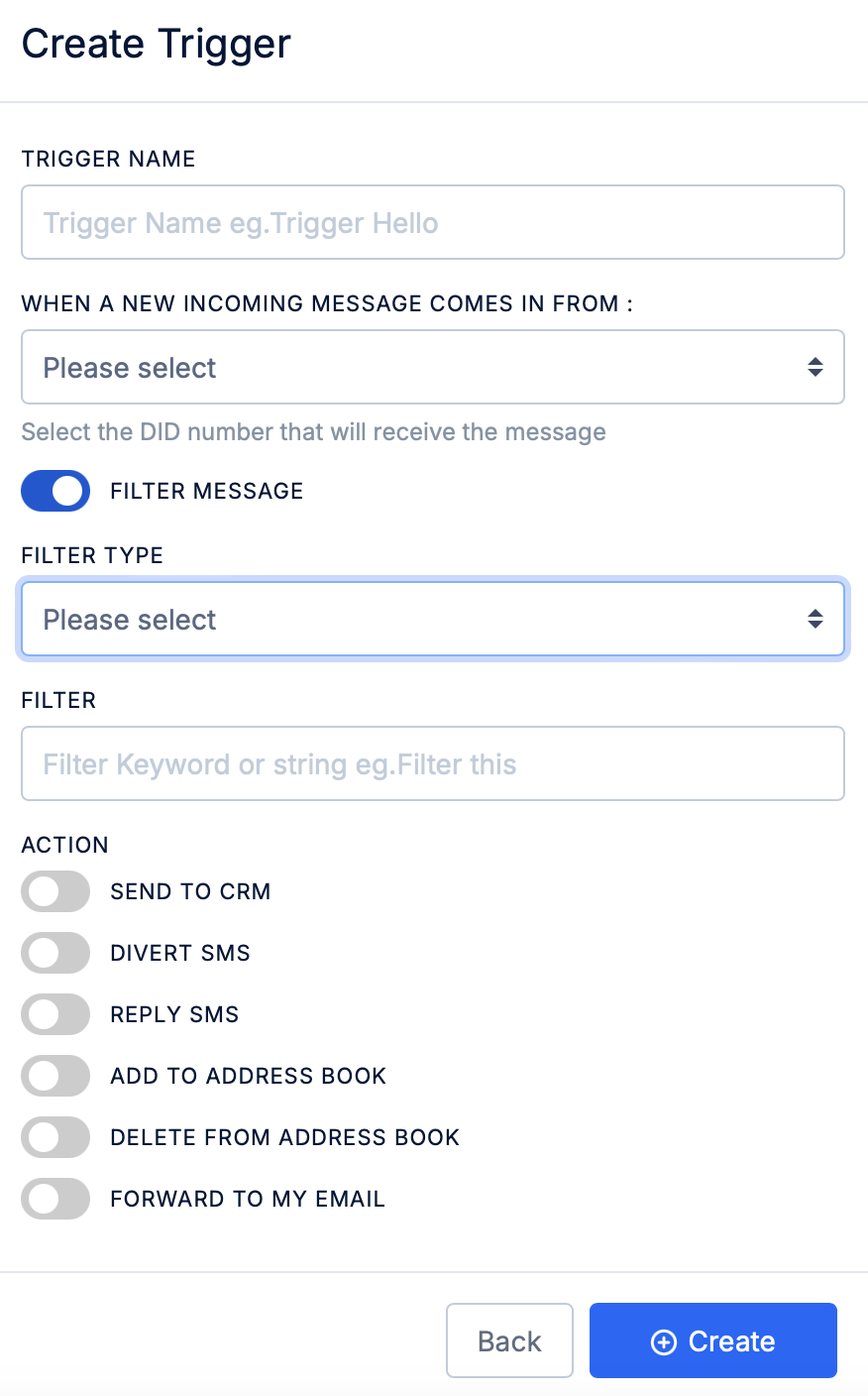 You can optionally setup the trigger to filter by what content is within the incoming text message. If you toggle ON the Filter Message button, you are then able to select an option whether the text message contains a certain word or phrase, or equals a specific content.